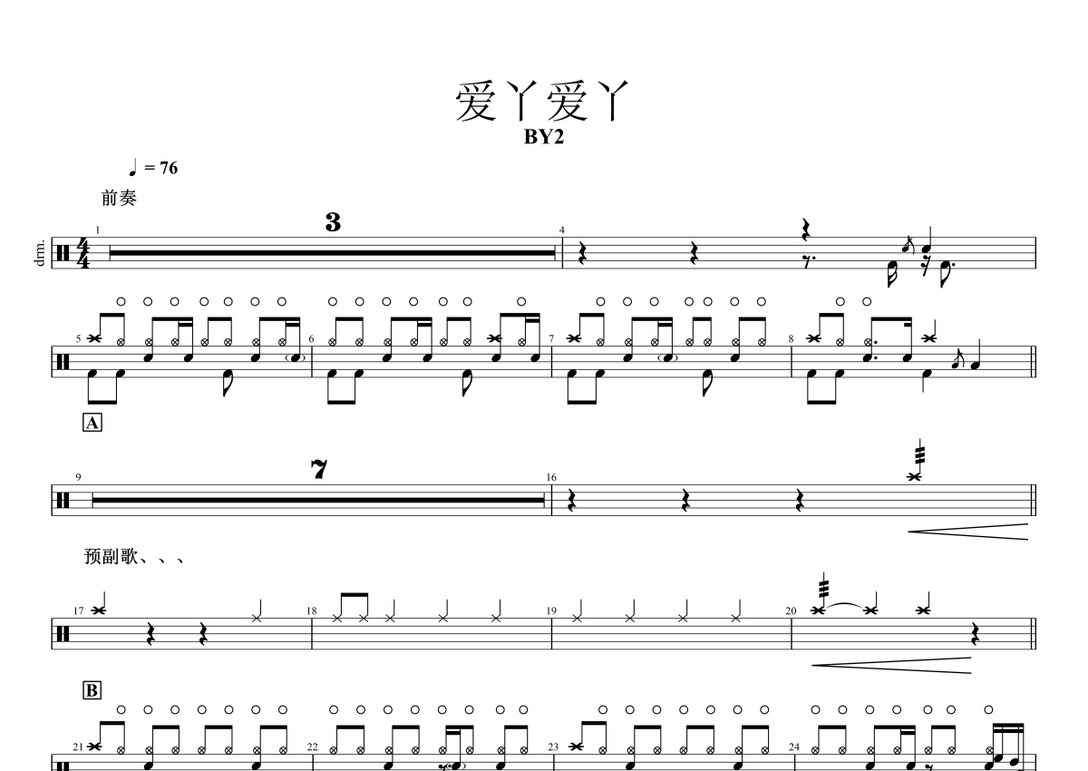 BY2《爱丫爱丫》架子鼓谱
