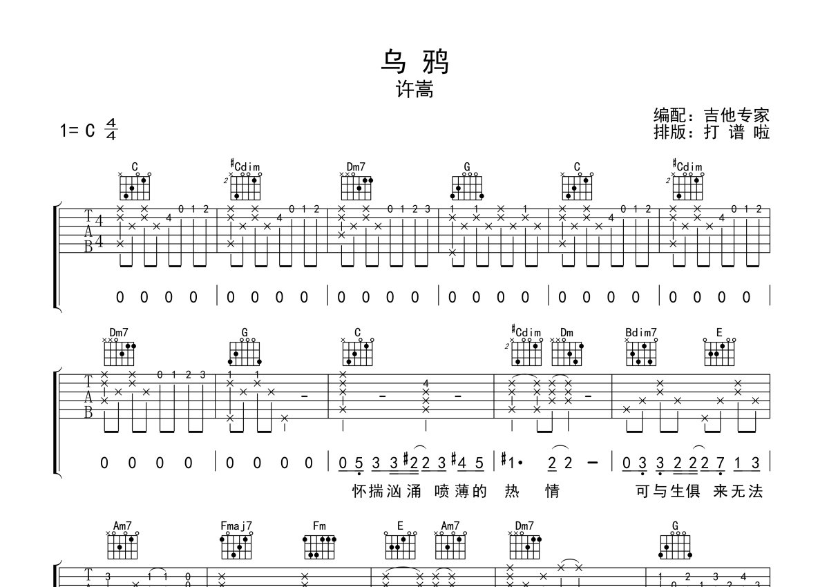 《乌鸦》是许嵩演唱的一首歌曲,本吉他谱采用的是C调指法编配,这份吉他谱共有三张高清图谱,图谱由 @吉他专家 编配上传,图谱使用六线谱编配,包含吉他和弦指法、简谱以及歌词部分,使用这份乌鸦吉他谱,可以让你更加方便地掌握这首歌曲的弹唱技巧,快来尝试吧。许嵩《乌鸦》吉他谱_C调吉他弹唱谱。