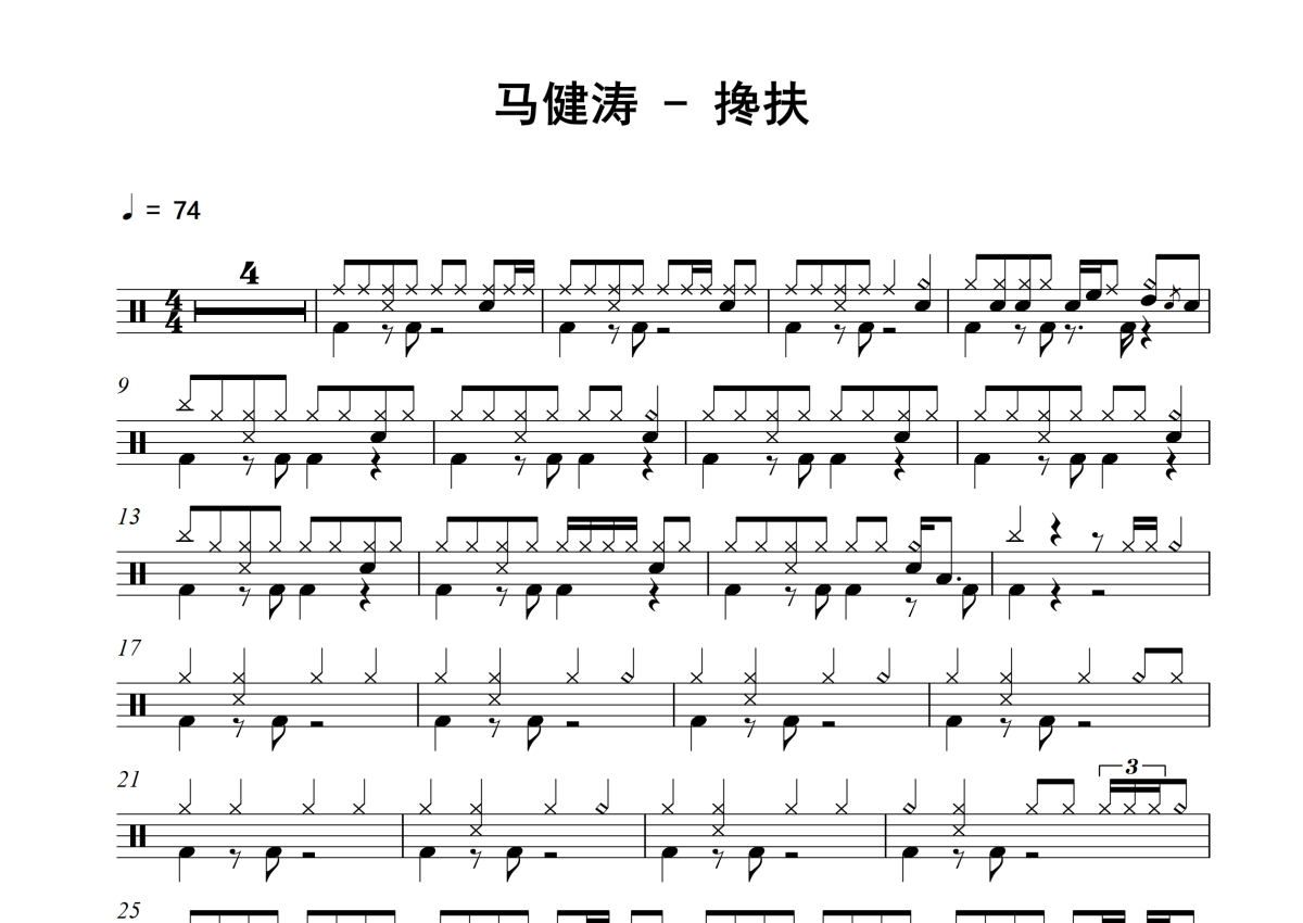 《搀扶》是马健涛演唱的一首歌曲,拍号为4/4拍,歌曲速度为每分钟74拍,这份架子鼓谱共有两张高清图谱,图谱由 @16分音符 编配上传,图谱使用五线谱编配,使用这份搀扶架子鼓谱,你将能够轻松地敲打出这首马健涛的搀扶,快来尝试吧。