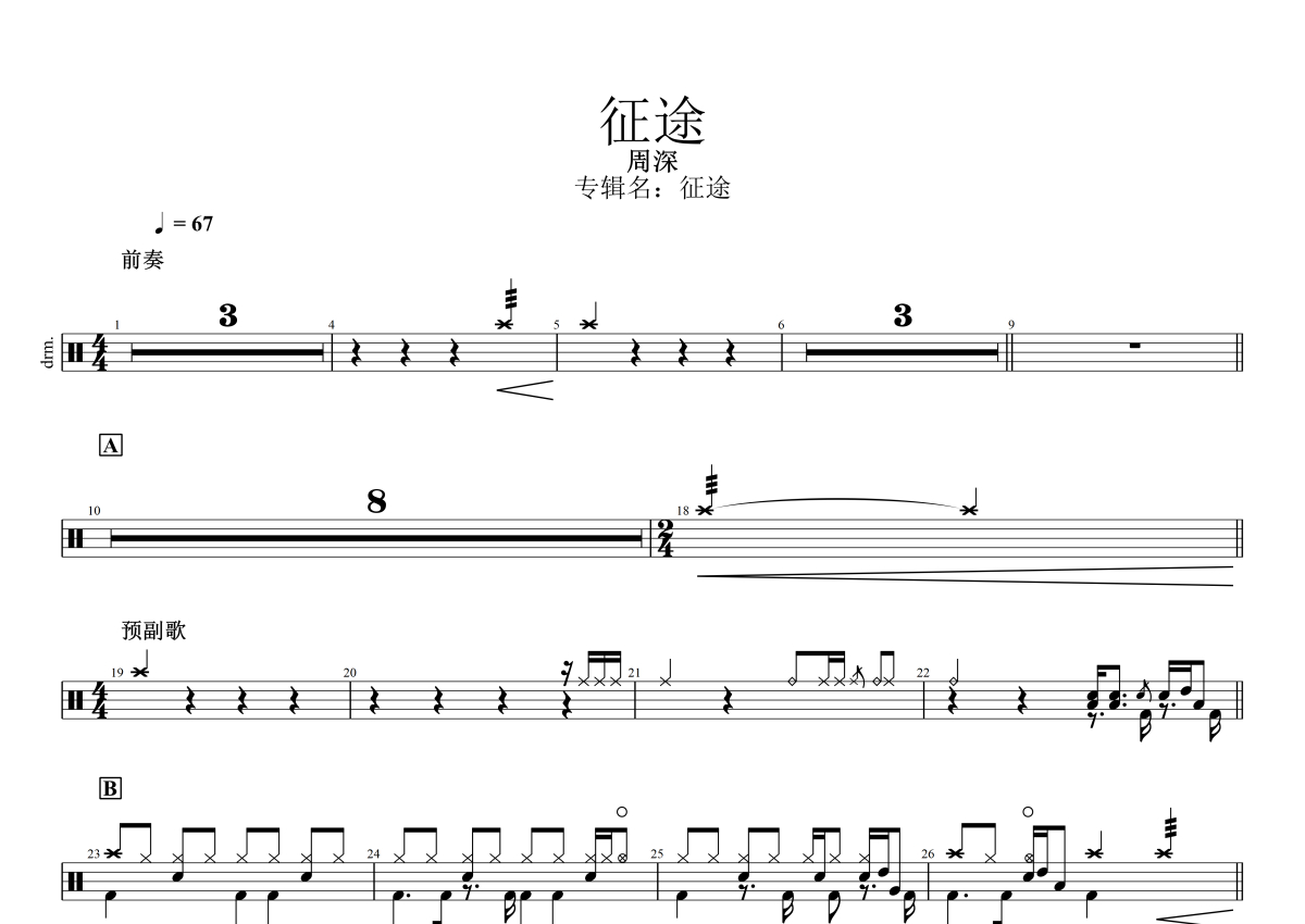 《征途》是周深演唱的一首歌曲,拍号为4/4拍,这份架子鼓谱共有两张高清图谱,图谱由 @小东鼓谱 编配上传,图谱使用五线谱编配,使用这份征途架子鼓谱,你将能够轻松地敲打出这首周深的征途,快来尝试吧。