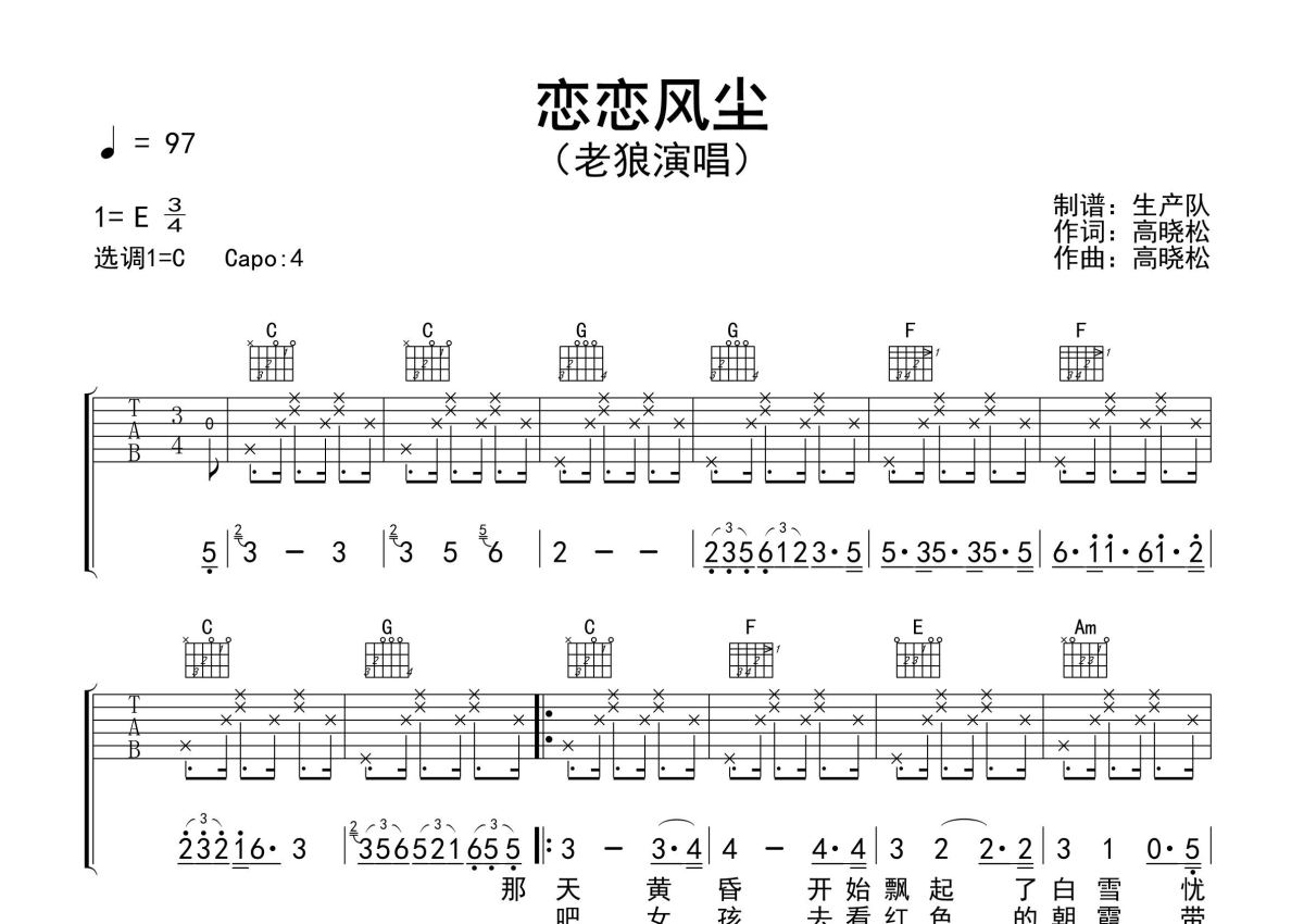《恋恋风尘》是老狼演唱的一首歌曲,精编完美版,拍号为3/4拍,歌曲速度为每分钟97拍,歌曲原调为E调,但由于原调指法比较难,为了方便弹奏,本吉他谱采用的是C调指法编配,变调夹4品弹奏即为原调,当然也可以根据自己的音域改变变调夹位置,或者通过改变和弦调性,以方便自己弹奏,这份吉他谱共有三张高清图谱,图谱由 @生产队 编配上传,图谱使用六线谱编配,包含吉他和弦指法、简谱以及歌词部分,使用这份恋恋风尘吉他谱,可以让你更加方便地掌握这首歌曲的弹唱技巧,快来尝试吧。老狼演唱的经典歌曲《恋恋风尘》原版吉他谱,含前奏、间奏、尾奏solo编配,精编完美版,致敬经典!。