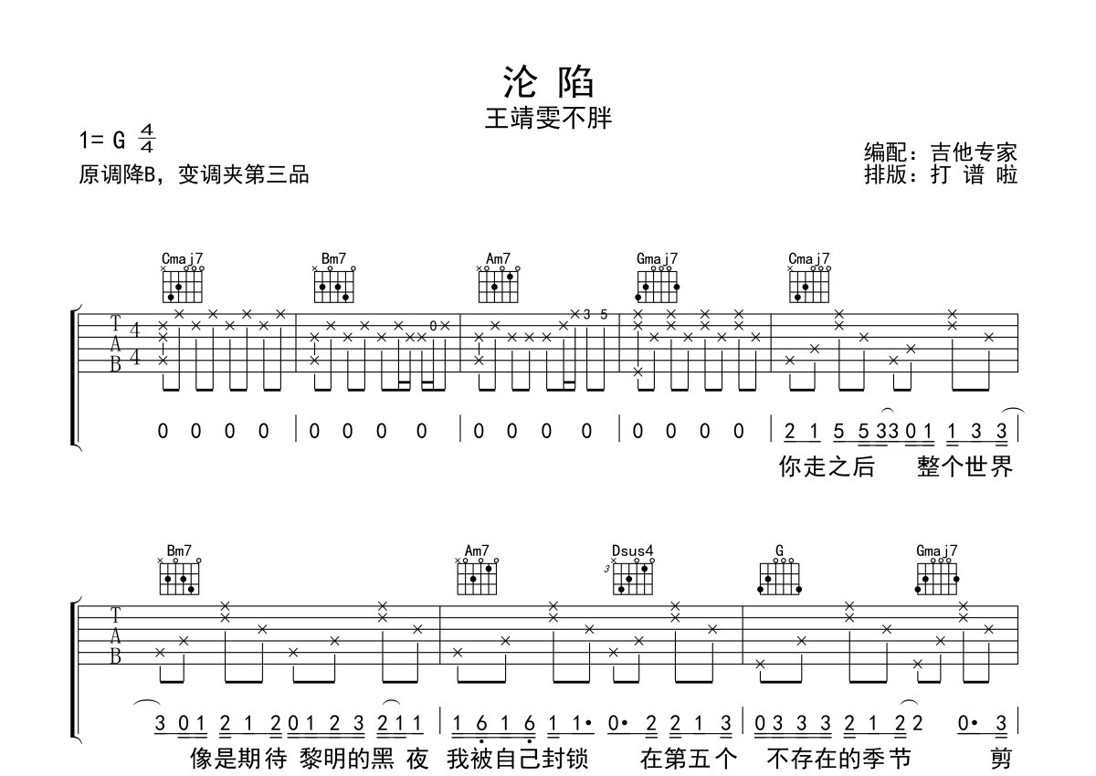 王靖雯不胖《沦陷》吉他谱 - G调弹唱六线谱