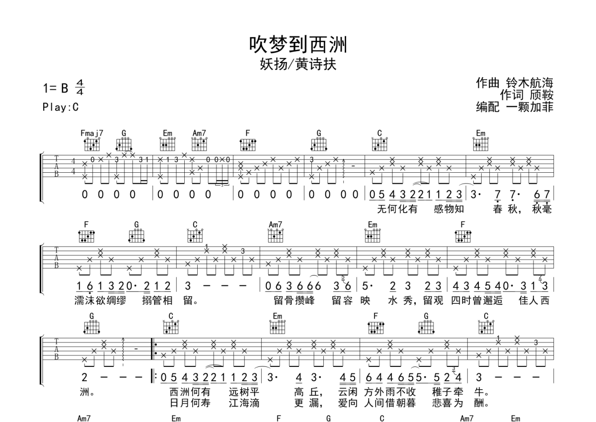 黄诗扶/妖扬《吹梦到西洲》吉他谱 - C调弹唱六线谱