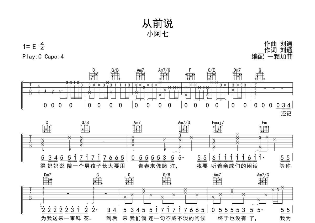 从前说吉他谱 - 小阿七演唱 - C调弹唱六线谱