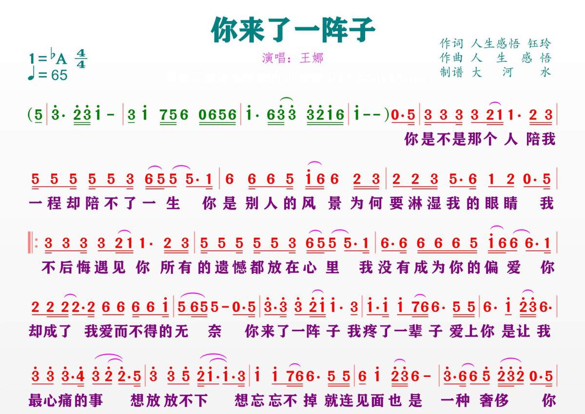 《你来了一阵子》是王娜演唱的一首歌曲,拍号为4/4拍,歌曲速度为每分钟65拍,这份简谱共有一张高清图谱,图谱由 @临海雪原 编配上传。