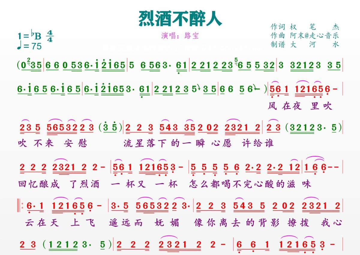 《烈酒不醉人》是路宝演唱的一首歌曲,拍号为4/4拍,歌曲速度为每分钟75拍,这份简谱共有一张高清图谱,图谱由 @临海雪原 编配上传。