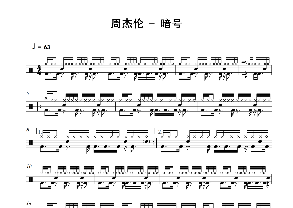 《暗号》是周杰伦演唱的一首歌曲,拍号为4/4拍,歌曲速度为每分钟63拍,这份架子鼓谱共有两张高清图谱,图谱由 @老天师丶 编配上传,图谱使用五线谱编配,使用这份暗号架子鼓谱,你将能够轻松地敲打出这首周杰伦的暗号,快来尝试吧。