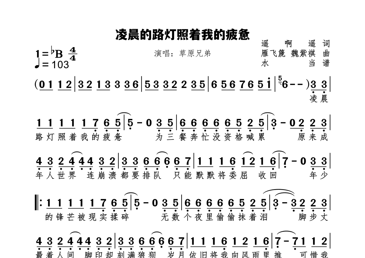《凌晨的路灯照着我的疲惫》是草原兄弟演唱的一首歌曲,拍号为4/4拍,歌曲速度为每分钟103拍,这份简谱共有一张高清图谱,图谱由 @水当 编配上传原调bB。