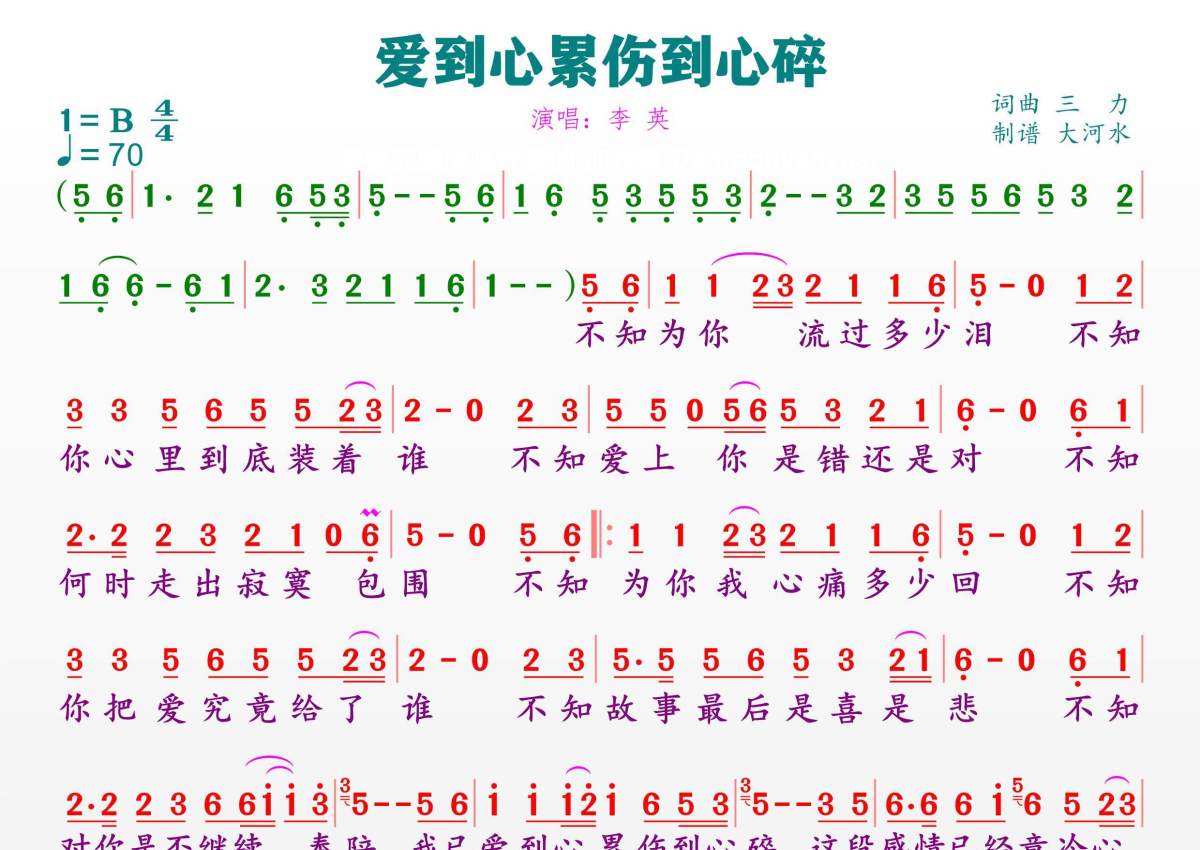 《爱到心累伤到心碎》是李英演唱的一首歌曲,拍号为4/4拍,歌曲速度为每分钟70拍,这份简谱共有一张高清图谱,图谱由 @临海雪原 编配上传。