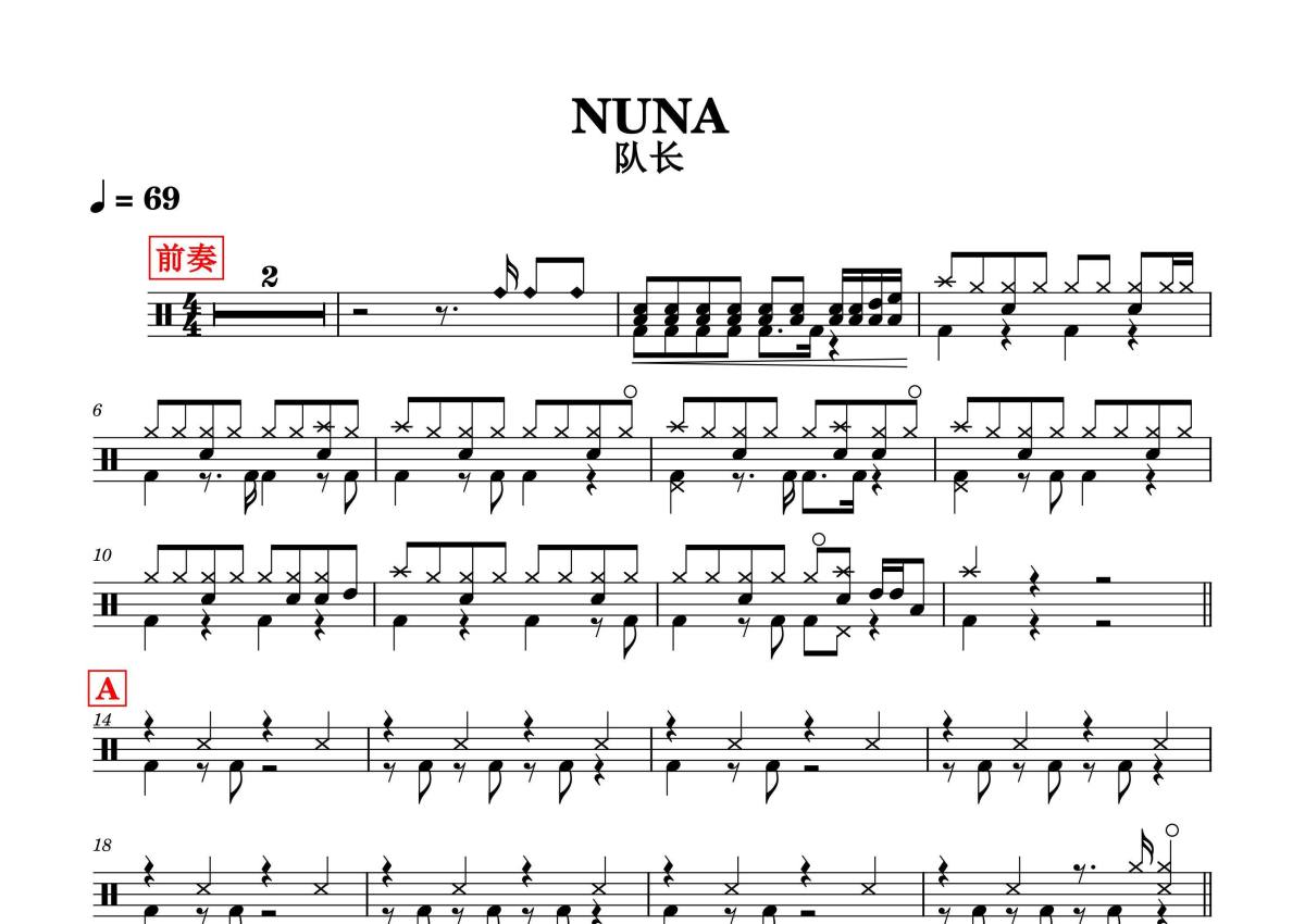 《NUNA》是队长演唱的一首歌曲,拍号为4/4拍,歌曲速度为每分钟69拍,这份架子鼓谱共有两张高清图谱,图谱由 @音符喷血者 编配上传,图谱使用五线谱编配,使用这份NUNA架子鼓谱,你将能够轻松地敲打出这首队长的NUNA,快来尝试吧。