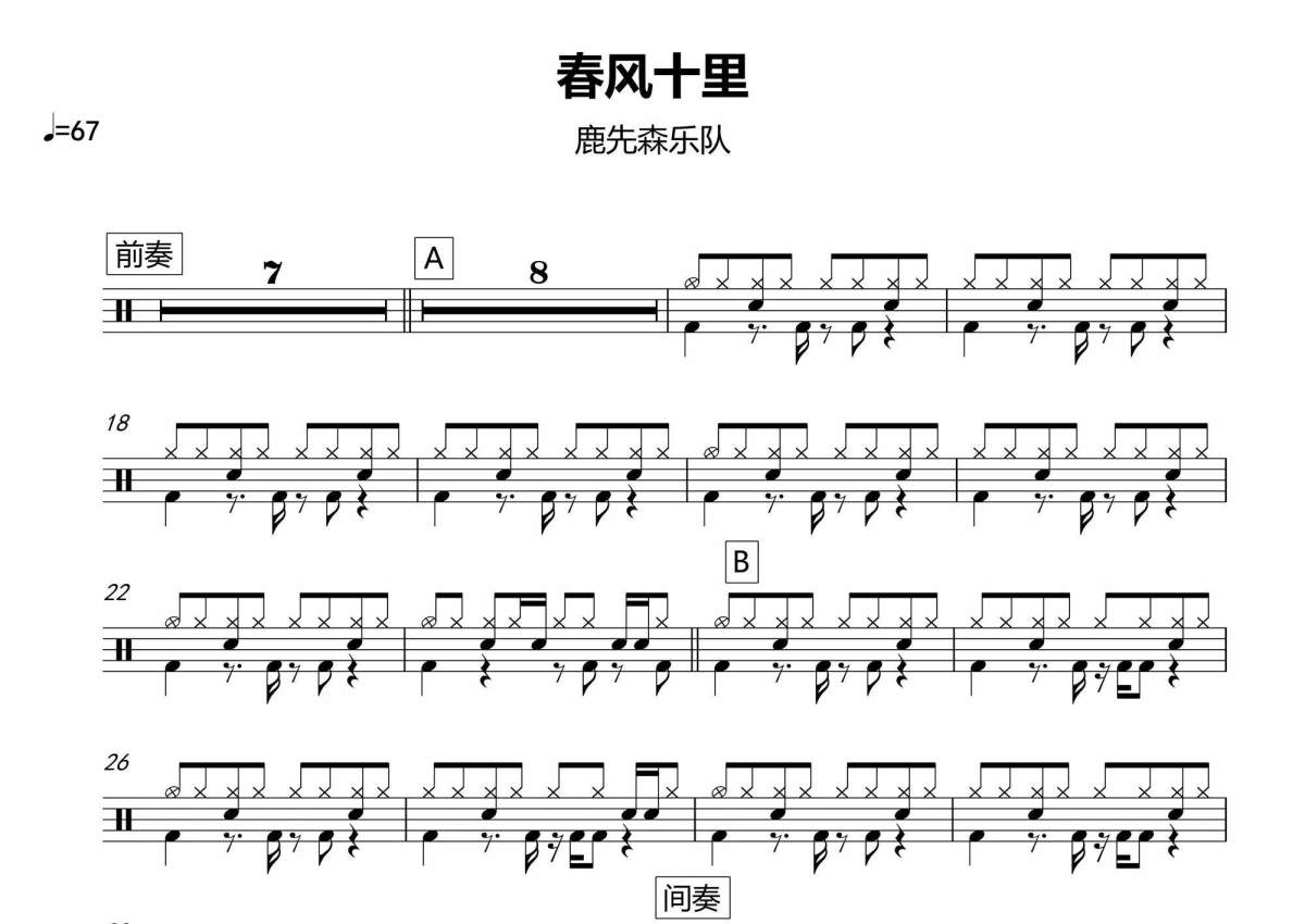 《春风十里》架子鼓谱 - 鹿先森乐队