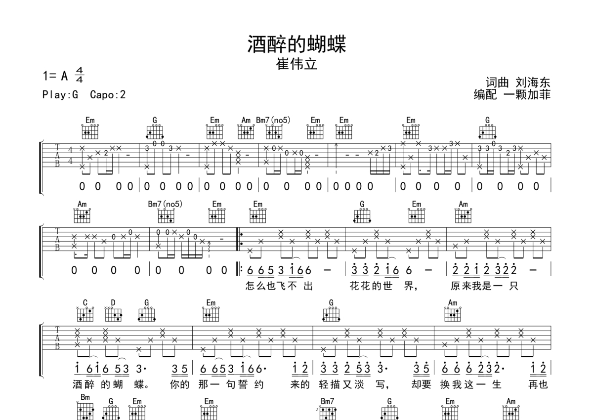 酒醉的蝴蝶吉他谱 - 崔伟立演唱 - G调弹唱六线谱