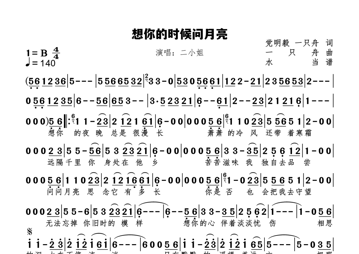 《想你的时候问月亮》是二小姐演唱的一首歌曲,拍号为4/4拍,歌曲速度为每分钟140拍,这份简谱共有一张高清图谱,图谱由 @水当 编配上传原调B。