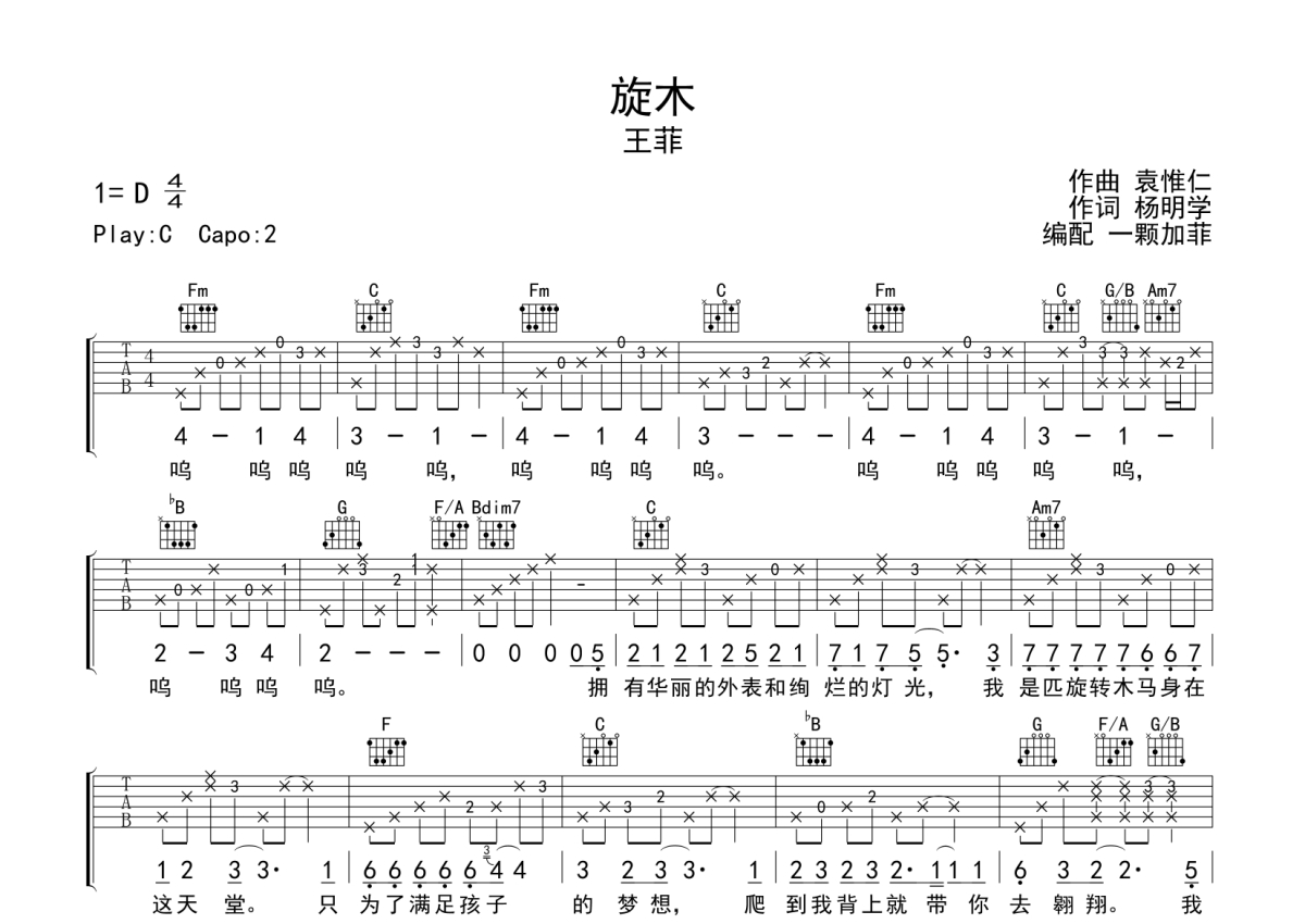 《旋木》是王菲演唱的一首歌曲,本吉他谱采用的是C调指法编配,这份吉他谱共有三张高清图谱,图谱由 @一颗加菲 编配上传,图谱使用六线谱编配,包含吉他和弦指法、简谱以及歌词部分,曲谱配备了相关的音频提供试听,使用这份旋木吉他谱,可以让你更加方便地掌握这首歌曲的弹唱技巧,快来尝试吧。