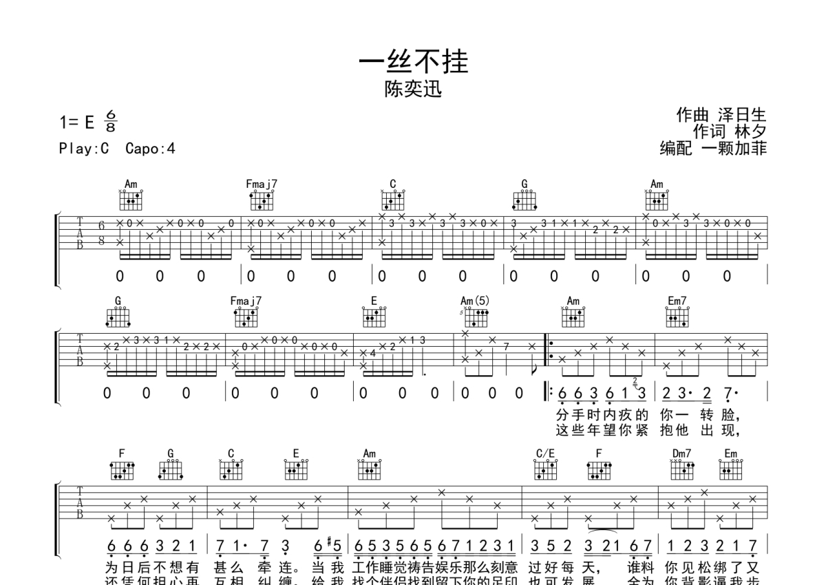 《一丝不挂》是陈奕迅演唱的一首歌曲,本吉他谱采用的是C调指法编配,这份吉他谱共有两张高清图谱,图谱由 @一颗加菲 编配上传,图谱使用六线谱编配,包含吉他和弦指法、简谱以及歌词部分,曲谱配备了相关的音频提供试听,使用这份一丝不挂吉他谱,可以让你更加方便地掌握这首歌曲的弹唱技巧,快来尝试吧。