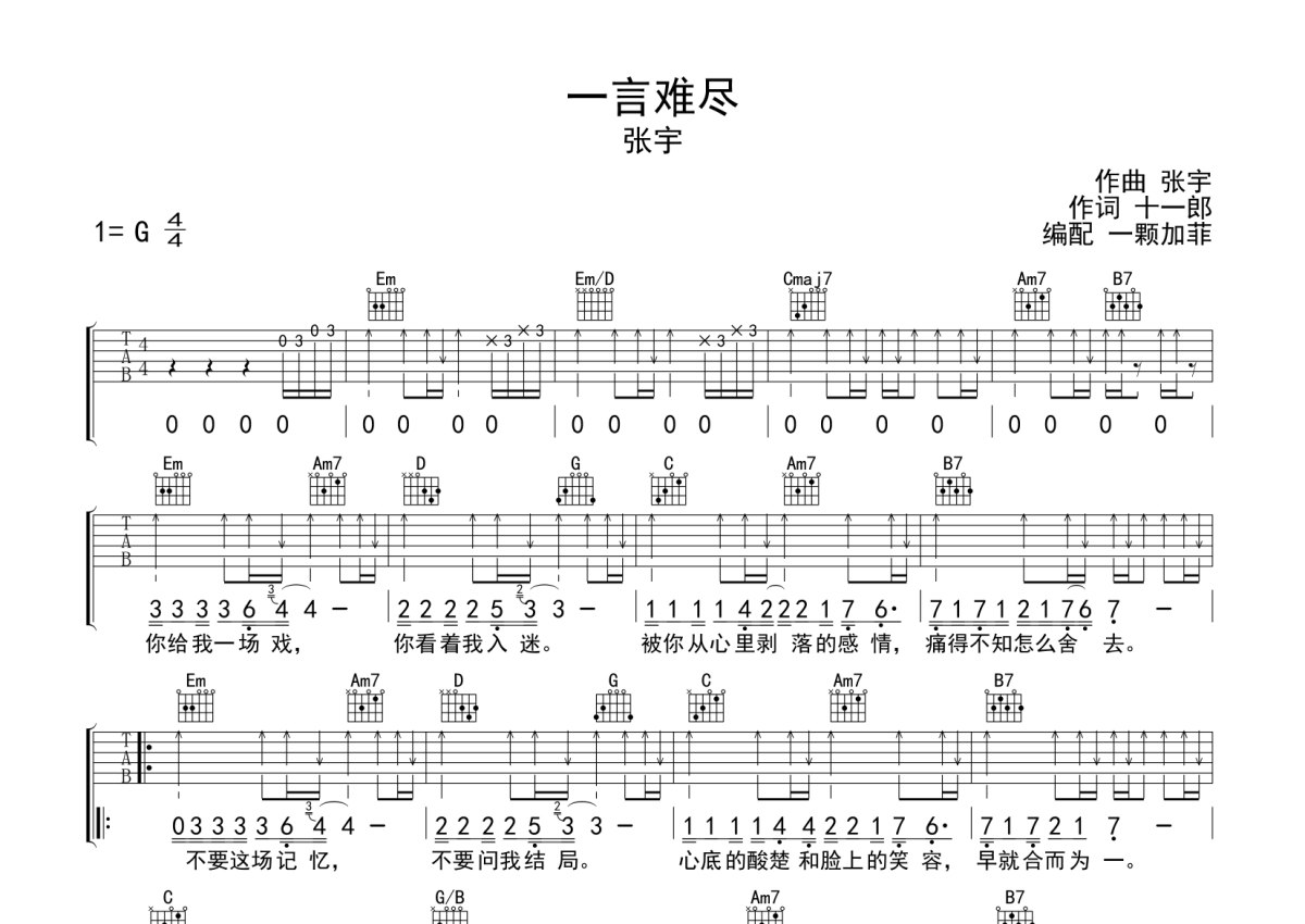 一言难尽吉他谱 - 张宇演唱 - G调弹唱六线谱