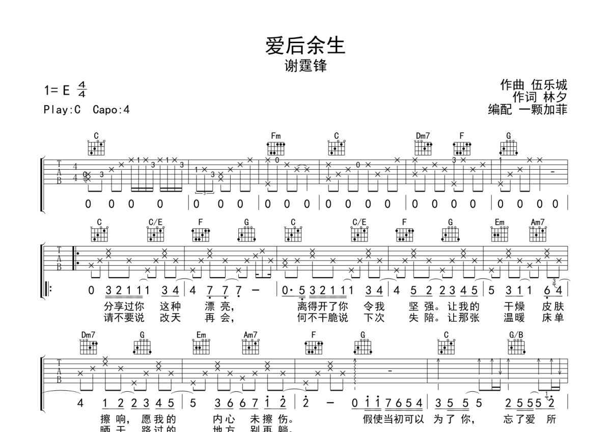 谢霆锋《爱后余生》吉他谱 - C调弹唱六线谱