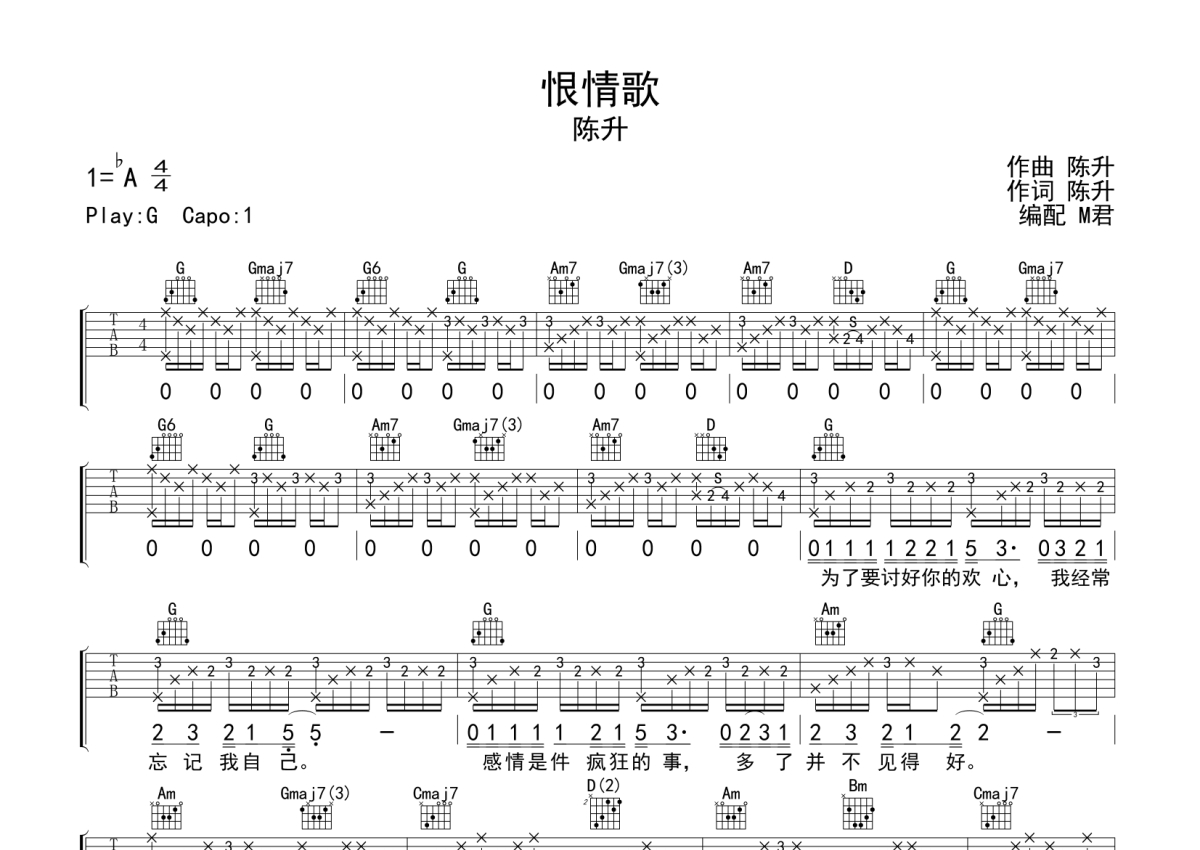 恨情歌吉他谱 - 陈升演唱 - G调弹唱六线谱