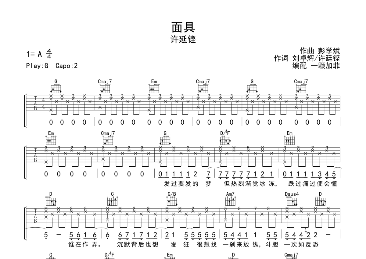 许延铿《面具》吉他谱 - G调弹唱六线谱