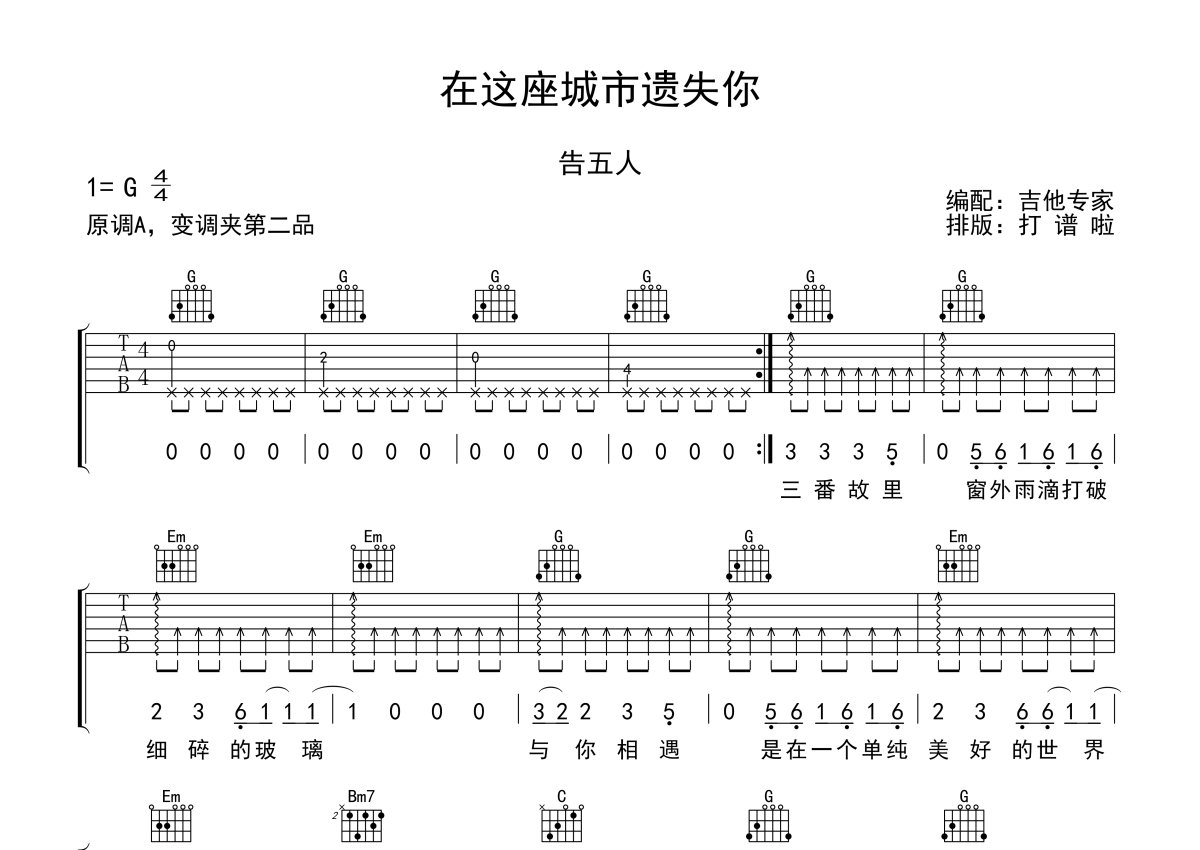 告五人《在这座城市遗失你》吉他谱 - G调弹唱六线谱