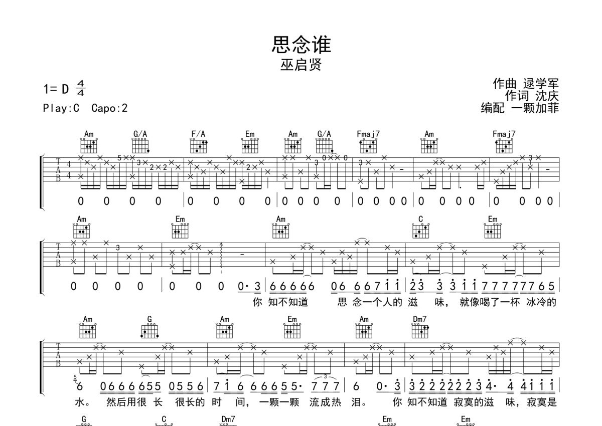 《思念谁》是巫启贤演唱的一首歌曲,本吉他谱采用的是C调指法编配,这份吉他谱共有两张高清图谱,图谱由 @一颗加菲 编配上传,图谱使用六线谱编配,包含吉他和弦指法、简谱以及歌词部分,曲谱配备了相关的音频提供试听,使用这份思念谁吉他谱,可以让你更加方便地掌握这首歌曲的弹唱技巧,快来尝试吧。