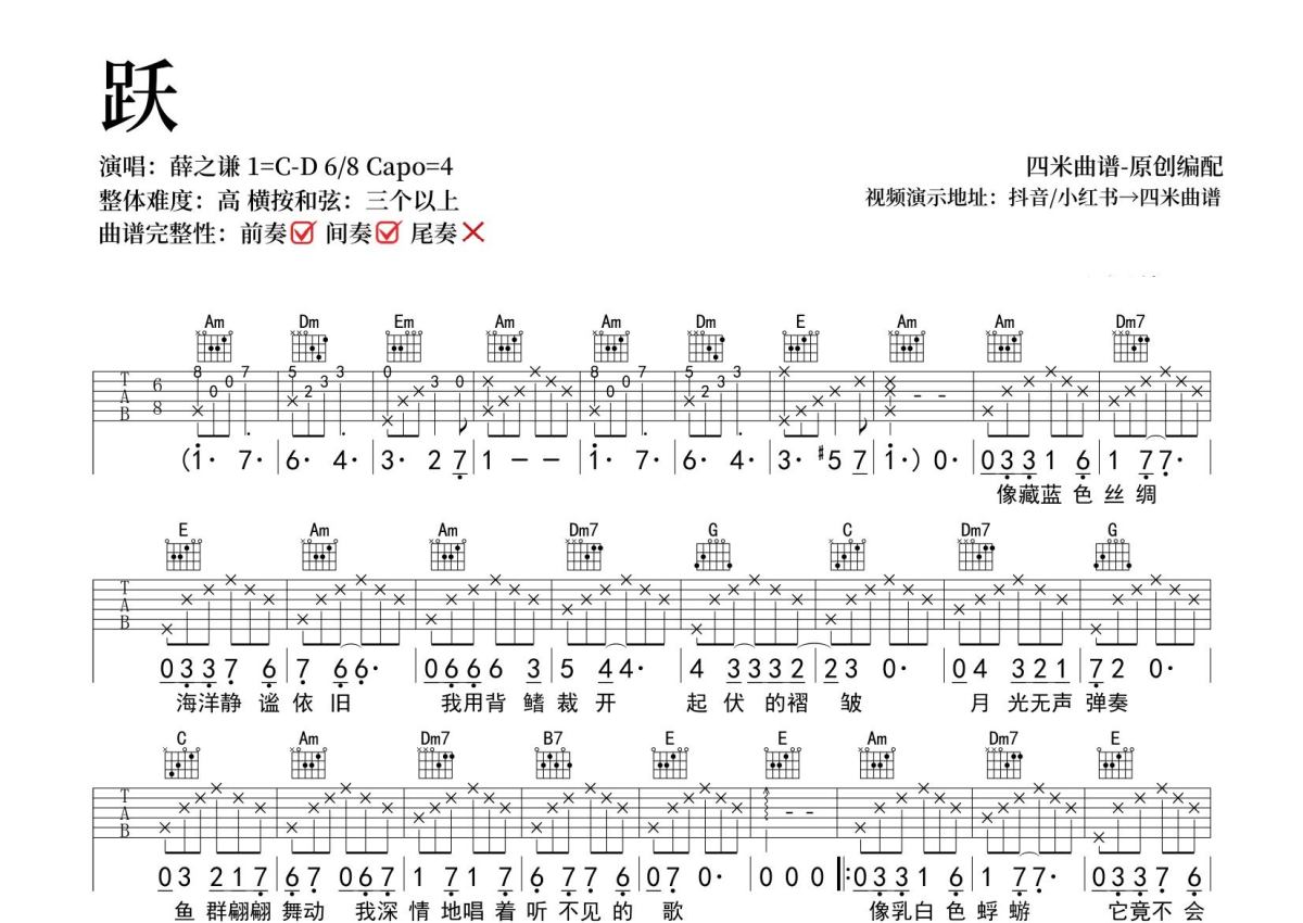 《跃》是薛之谦演唱的一首歌曲,拍号为6/8拍,歌曲原调为E调,但由于原调指法比较难,为了方便弹奏,本吉他谱采用的是C调指法编配,变调夹4品弹奏即为原调,当然也可以根据自己的音域改变变调夹位置,或者通过改变和弦调性,以方便自己弹奏,这份吉他谱共有两张高清图谱,图谱由 @SRV7758521 编配上传,图谱使用六线谱编配,包含吉他和弦指法、简谱以及歌词部分,使用这份跃吉他谱,可以让你更加方便地掌握这首歌曲的弹唱技巧,快来尝试吧。