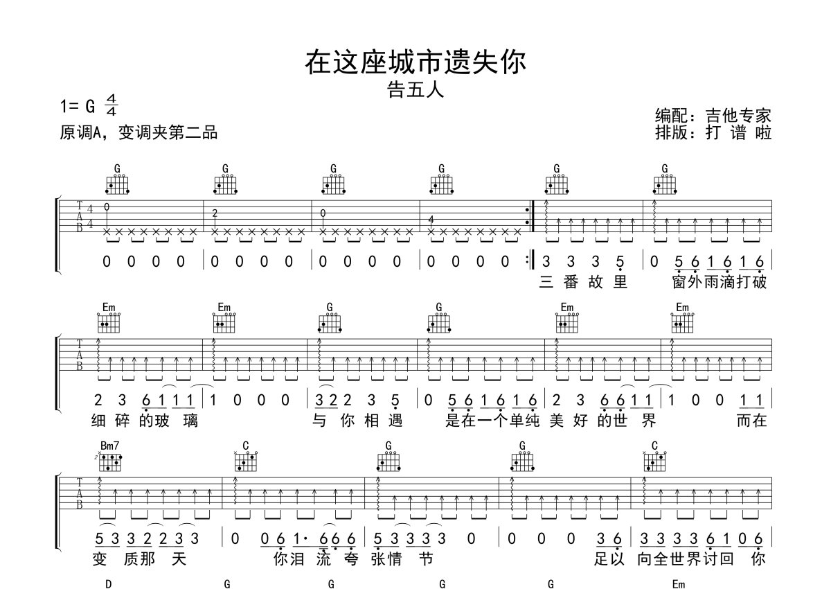 告五人《在这座城市遗失你》吉他谱 - G调弹唱六线谱 - 免翻页版