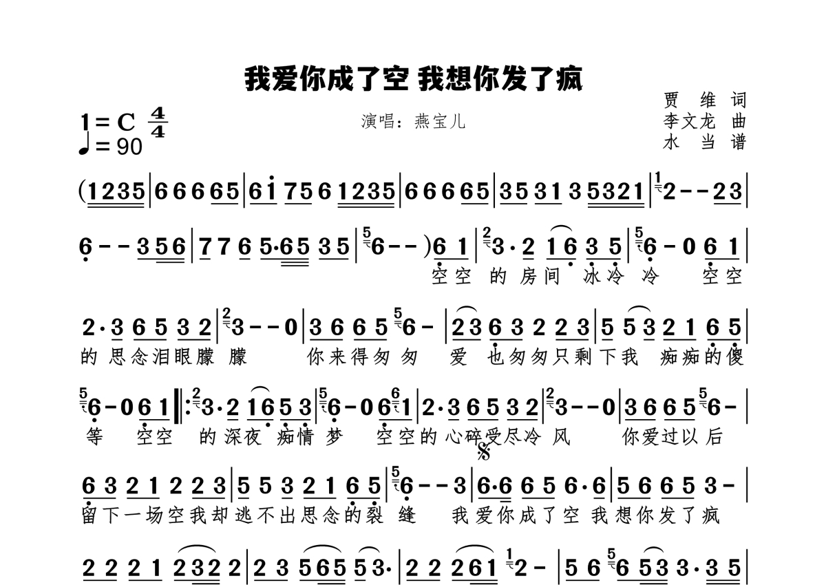 《我爱你成了空我想你发了疯》是燕宝儿演唱的一首歌曲,拍号为4/4拍,歌曲速度为每分钟90拍,这份简谱共有一张高清图谱,图谱由 @水当 编配上传原调C。