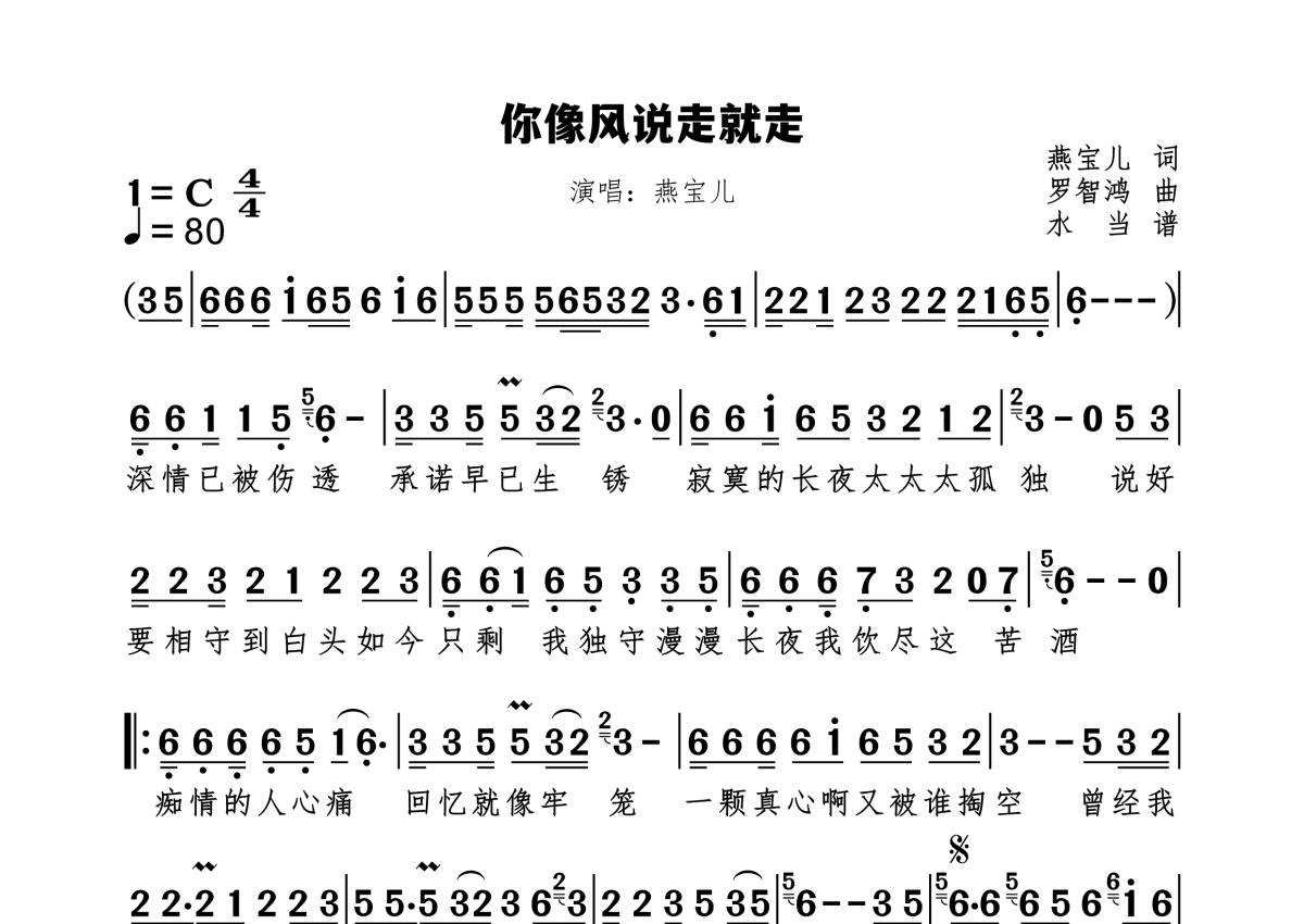 你像风说走就走简谱 - 燕宝儿演唱