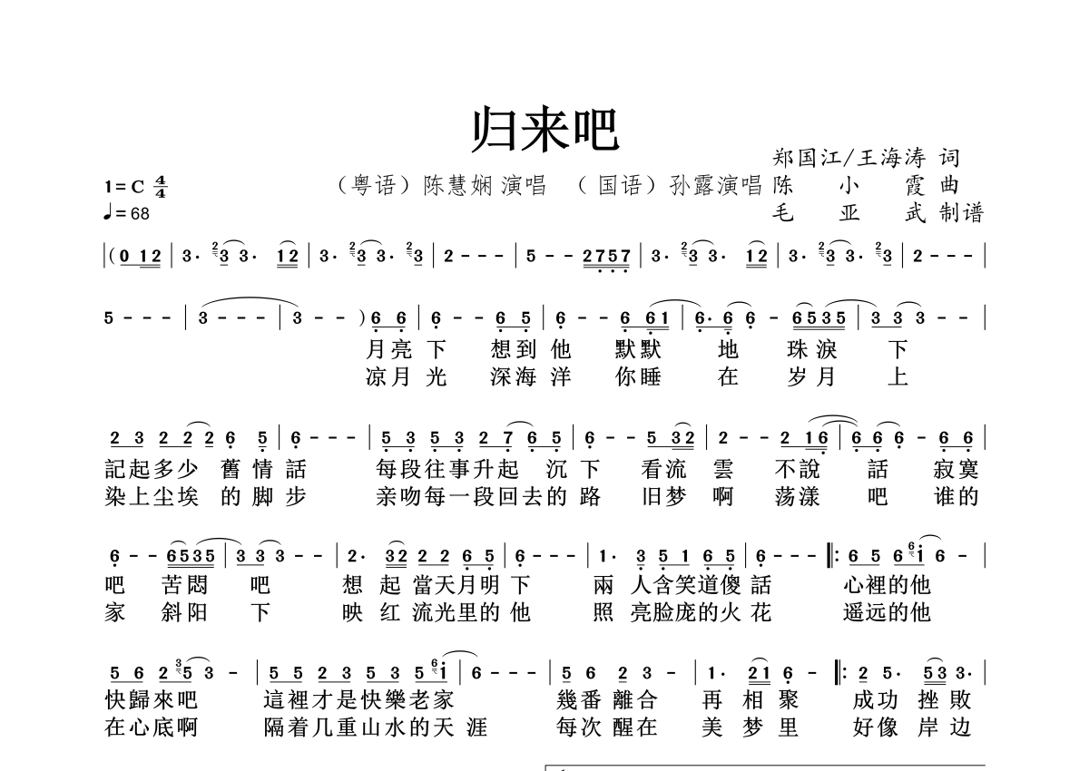 《归来吧》是陈慧娴演唱的一首歌曲,拍号为4/4拍,这份简谱共有一张高清图谱,图谱由 @秋天的童话 编配上传。