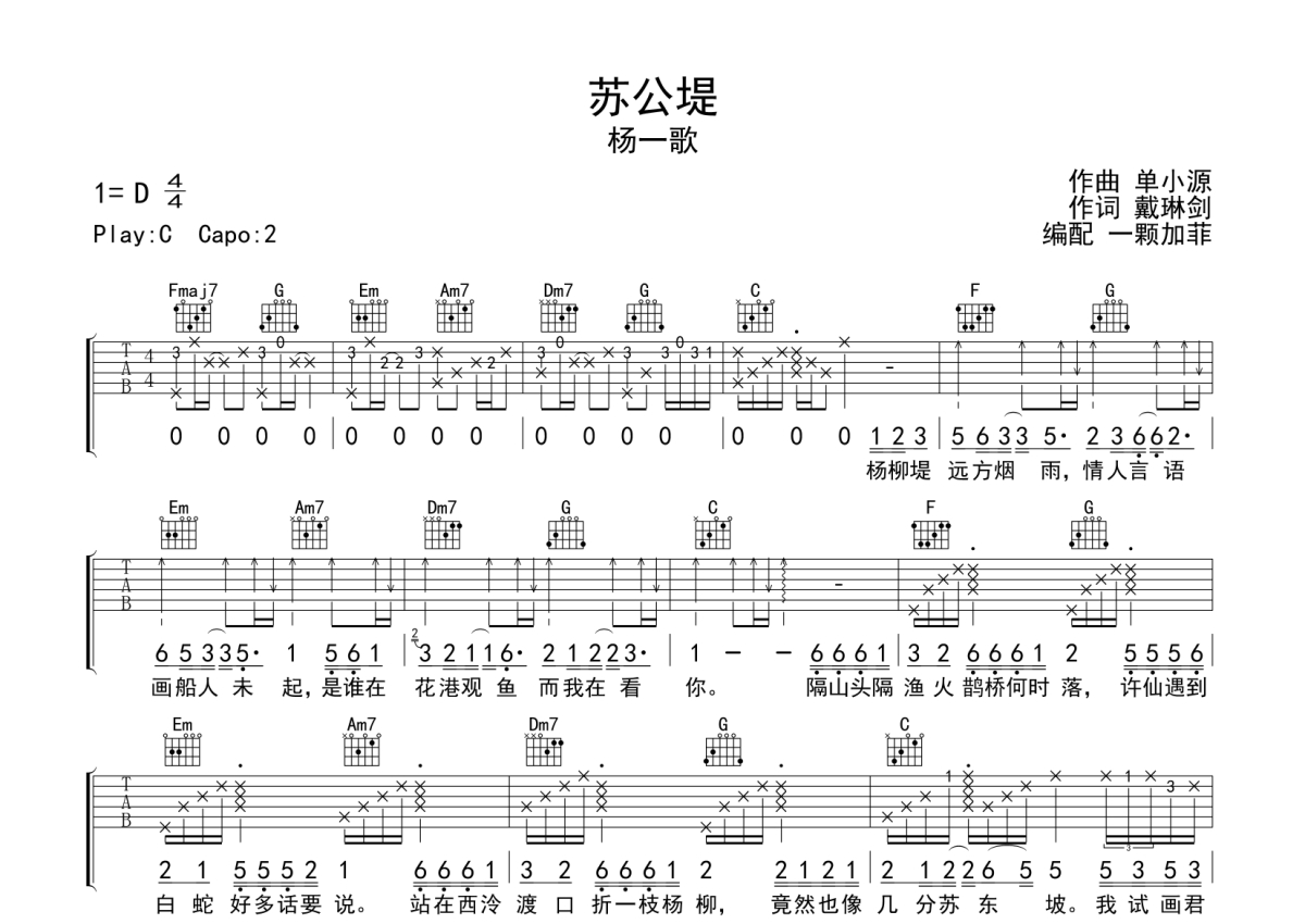 杨一歌《苏公堤》吉他谱 - C调弹唱六线谱