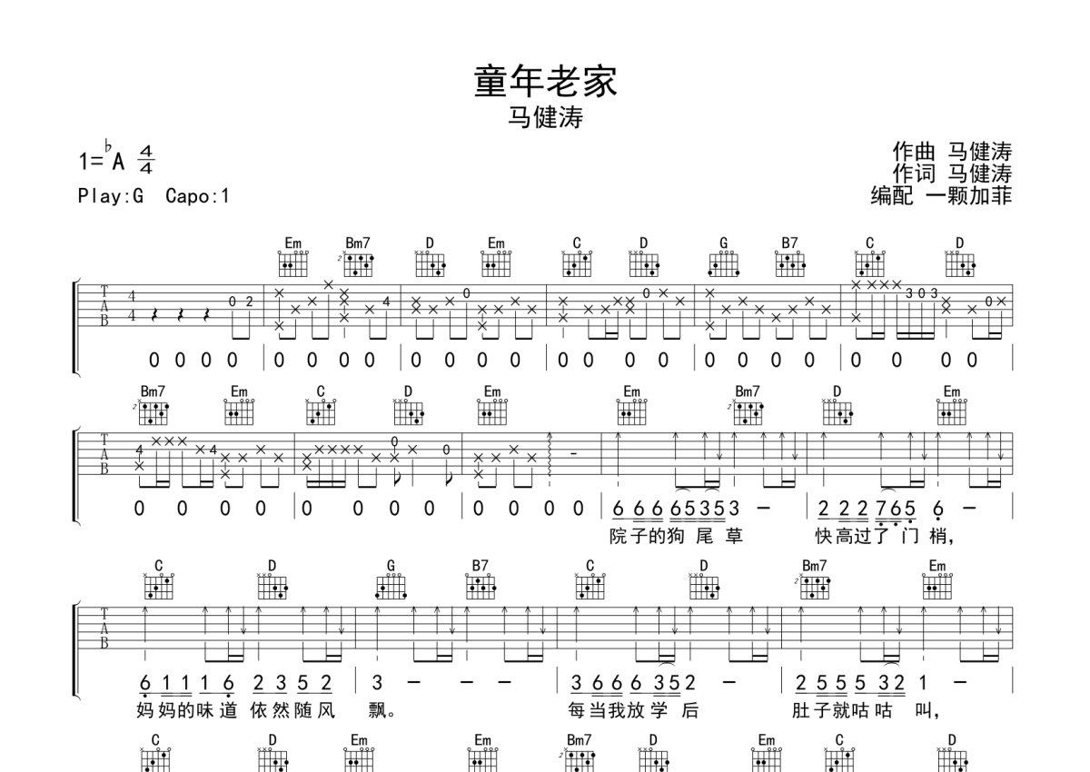 马健涛《童年老家》吉他谱 - G调弹唱六线谱