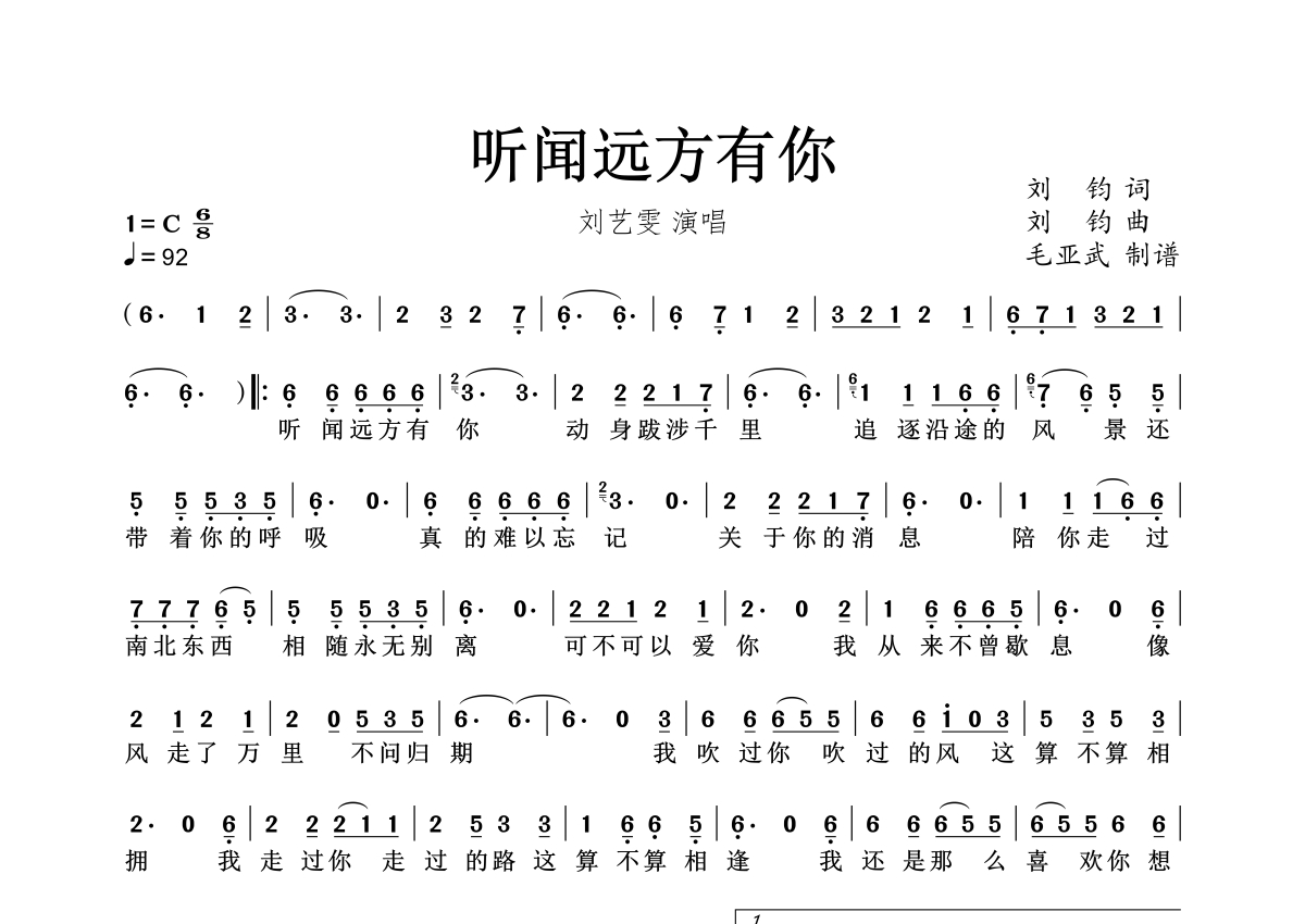 《听闻远方有你》是刘艺雯演唱的一首歌曲,拍号为6/8拍,这份简谱共有一张高清图谱,图谱由 @秋天的童话 编配上传。
