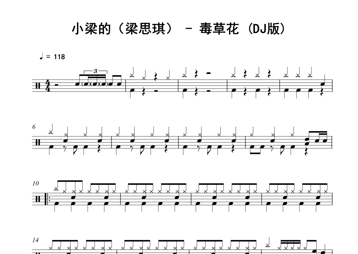 《毒草花 (DJ版)》是小梁的(梁思琪)演唱的一首歌曲,拍号为4/4拍,歌曲速度为每分钟118拍,这份架子鼓谱共有两张高清图谱,图谱由 @16分音符 编配上传,图谱使用五线谱编配,使用这份毒草花 (DJ版)架子鼓谱,你将能够轻松地敲打出这首小梁的(梁思琪)的毒草花 (DJ版),快来尝试吧。