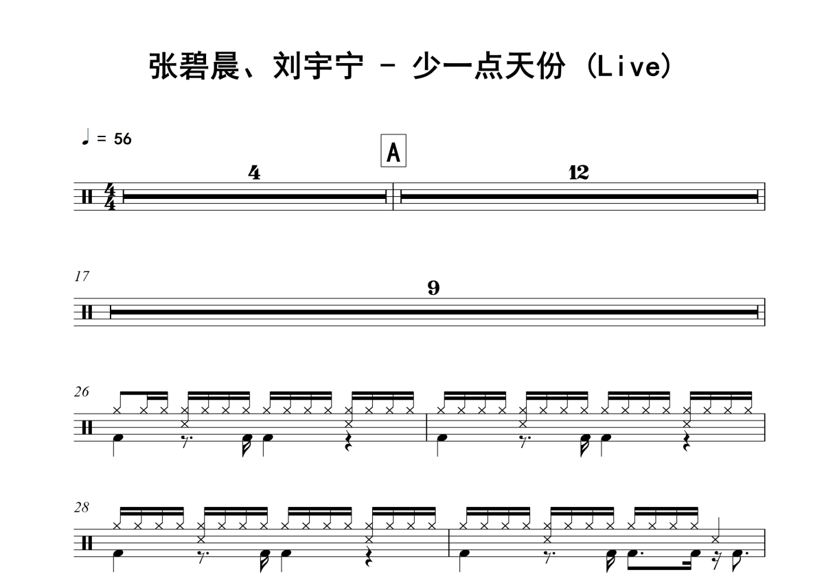 张碧晨、刘宇宁《少一点天份》架子鼓谱 - Live
