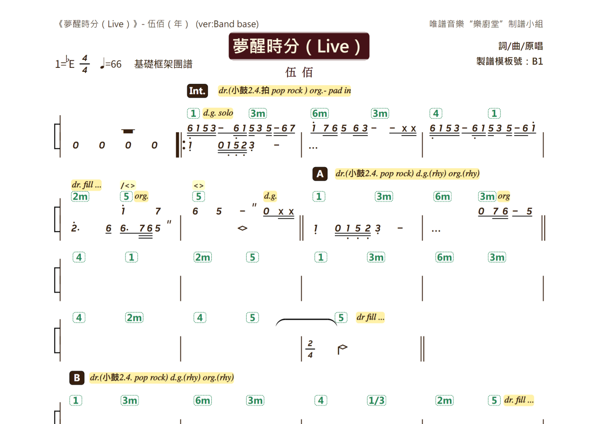 伍佰《梦醒时分(Live)》乐队总谱 - 基础框架版团谱