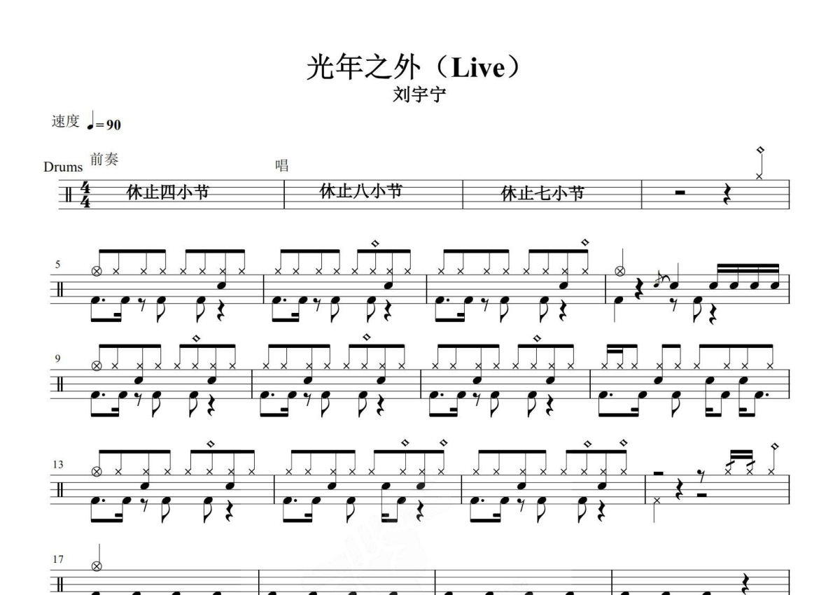 《光年之外》是刘宇宁演唱的一首歌曲,拍号为4/4拍,歌曲速度为每分钟90拍,这份架子鼓谱共有两张高清图谱,图谱由 @音符喷血者 编配上传,图谱使用五线谱编配,使用这份光年之外架子鼓谱,你将能够轻松地敲打出这首刘宇宁的光年之外,快来尝试吧。