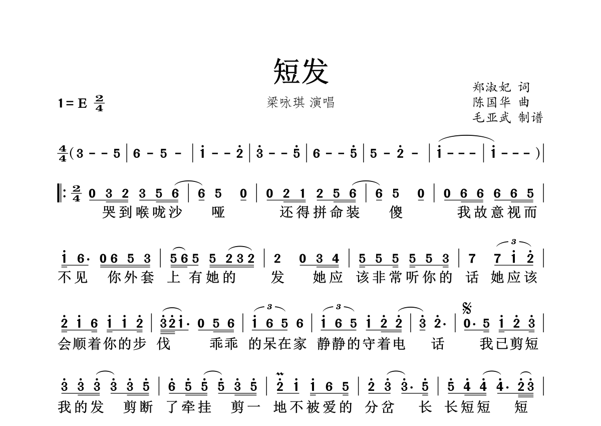 《短发》是梁咏琪演唱的一首歌曲,这份简谱共有一张高清图谱,图谱由 @秋天的童话 编配上传。