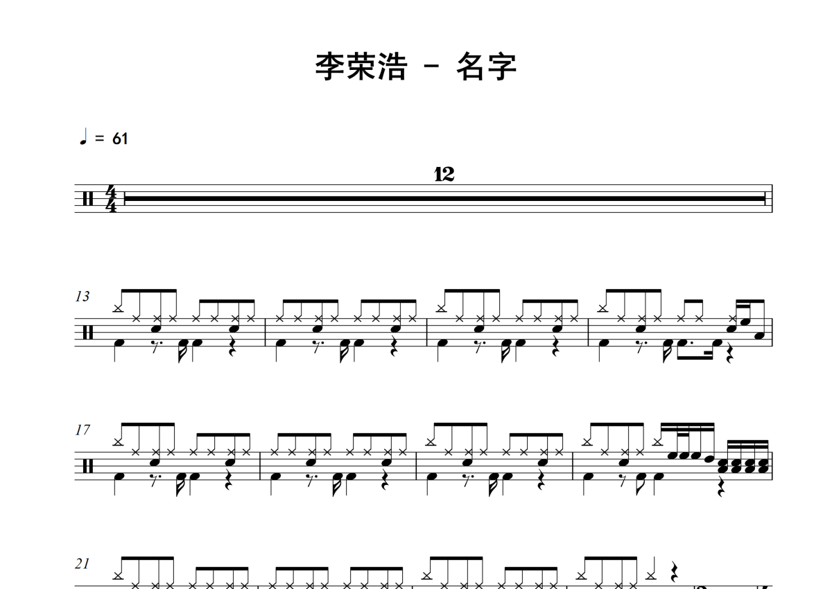 《名字》是李荣浩演唱的一首歌曲,拍号为4/4拍,歌曲速度为每分钟61拍,这份架子鼓谱共有两张高清图谱,图谱由 @老虎不说谎 编配上传,图谱使用五线谱编配,使用这份名字架子鼓谱,你将能够轻松地敲打出这首李荣浩的名字,快来尝试吧。