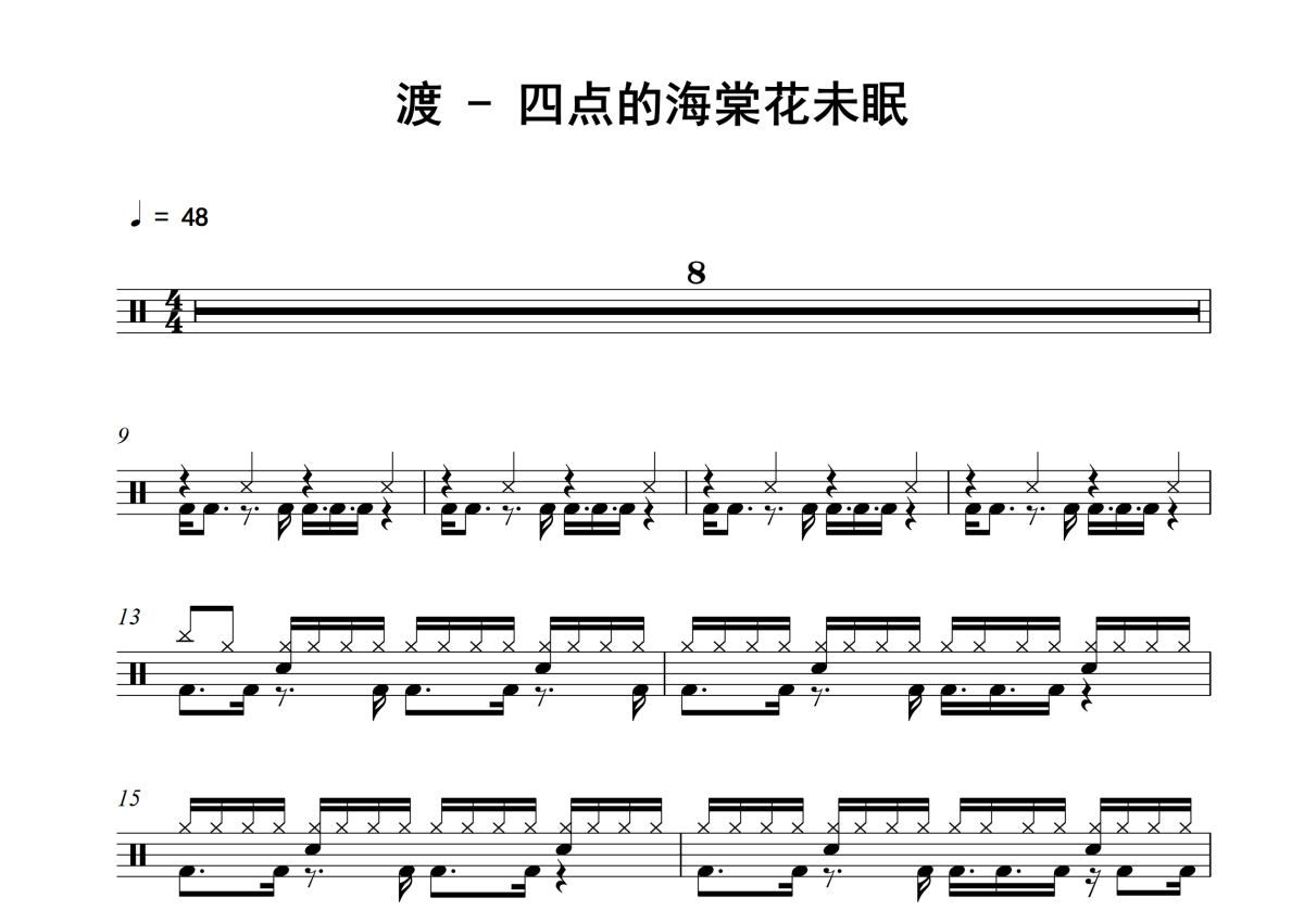《四点的海棠花未眠》是渡演唱的一首歌曲,拍号为4/4拍,歌曲速度为每分钟48拍,这份架子鼓谱共有两张高清图谱,图谱由 @老虎不说谎 编配上传,图谱使用五线谱编配,使用这份四点的海棠花未眠架子鼓谱,你将能够轻松地敲打出这首渡的四点的海棠花未眠,快来尝试吧。