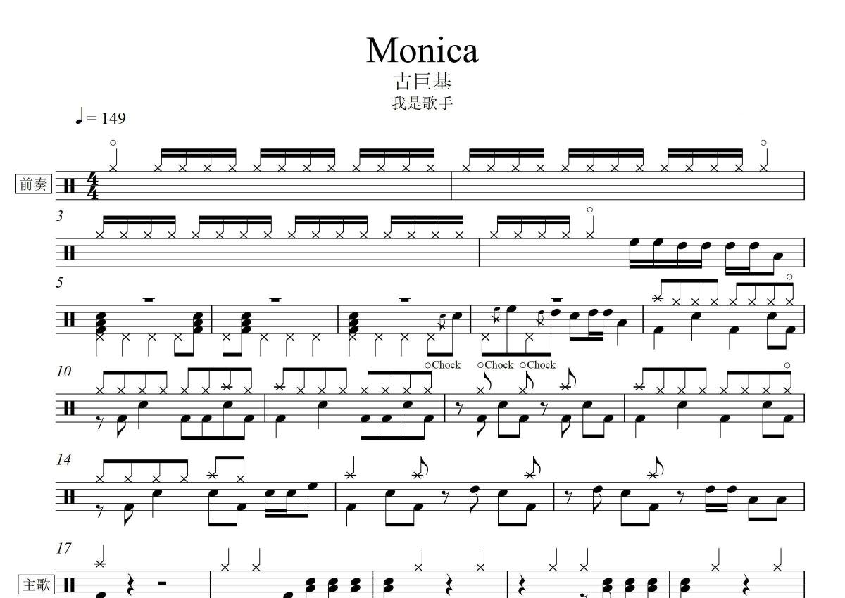 《Monica》是古巨基演唱的一首歌曲,拍号为4/4拍,歌曲速度为每分钟149拍,这份架子鼓谱共有三张高清图谱,图谱由 @音符喷血者 编配上传,图谱使用五线谱编配,使用这份Monica架子鼓谱,你将能够轻松地敲打出这首古巨基的Monica,快来尝试吧。