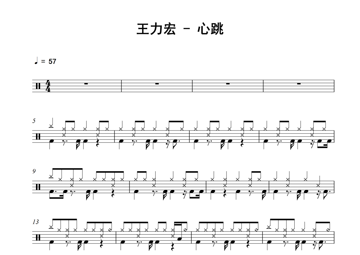 《心跳》是王力宏演唱的一首歌曲,拍号为4/4拍,歌曲速度为每分钟57拍,这份架子鼓谱共有两张高清图谱,图谱由 @老虎不说谎 编配上传,图谱使用五线谱编配,使用这份心跳架子鼓谱,你将能够轻松地敲打出这首王力宏的心跳,快来尝试吧。