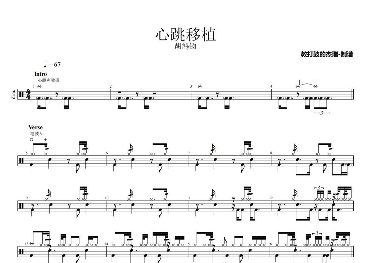 《心跳移植》是胡鸿钧演唱的一首歌曲,拍号为4/4拍,歌曲速度为每分钟67拍,这份架子鼓谱共有两张高清图谱,图谱由 @Jerry 编配上传,图谱使用五线谱编配,使用这份心跳移植架子鼓谱,你将能够轻松地敲打出这首胡鸿钧的心跳移植,快来尝试吧。