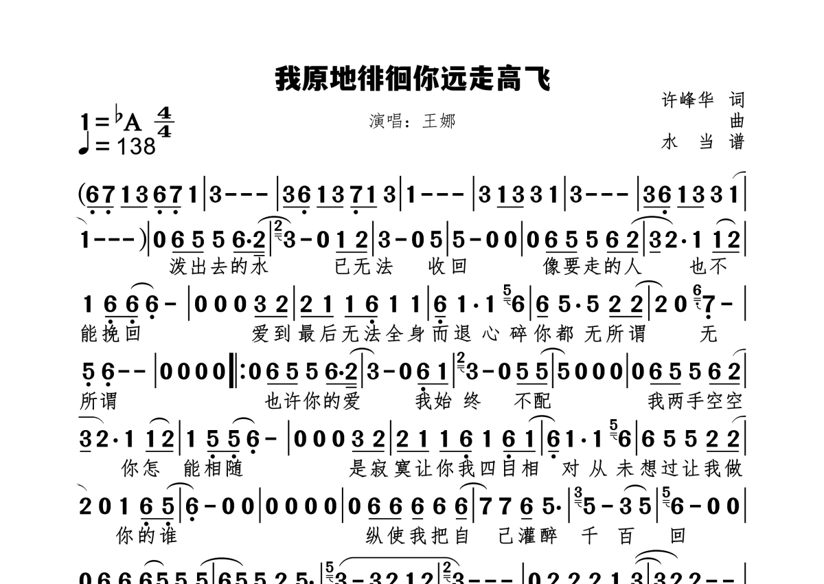 《我原地徘徊你远走高飞》是王娜演唱的一首歌曲,拍号为4/4拍,歌曲速度为每分钟138拍,这份简谱共有一张高清图谱,图谱由 @水当 编配上传原调bA。