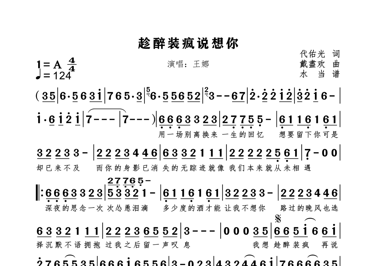 《趁醉装疯说想你》是王娜演唱的一首歌曲,拍号为4/4拍,歌曲速度为每分钟124拍,这份简谱共有一张高清图谱,图谱由 @水当 编配上传原调A。