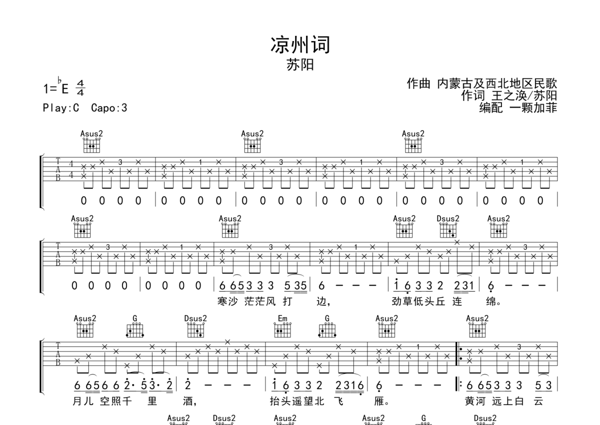 凉州词吉他谱 - 苏阳演唱 - C调弹唱六线谱