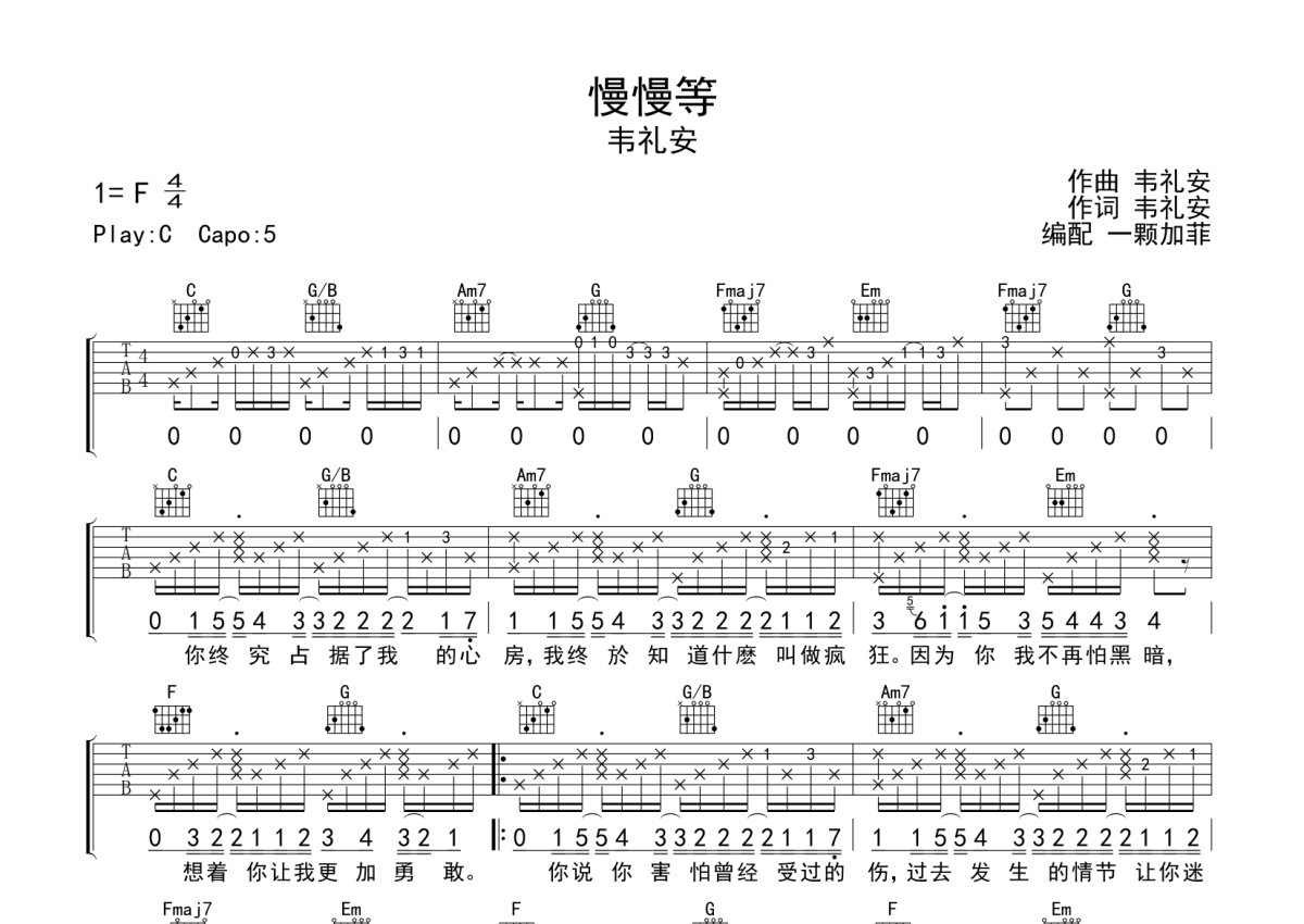 慢慢等吉他谱 - 韦礼安演唱 - C调弹唱六线谱