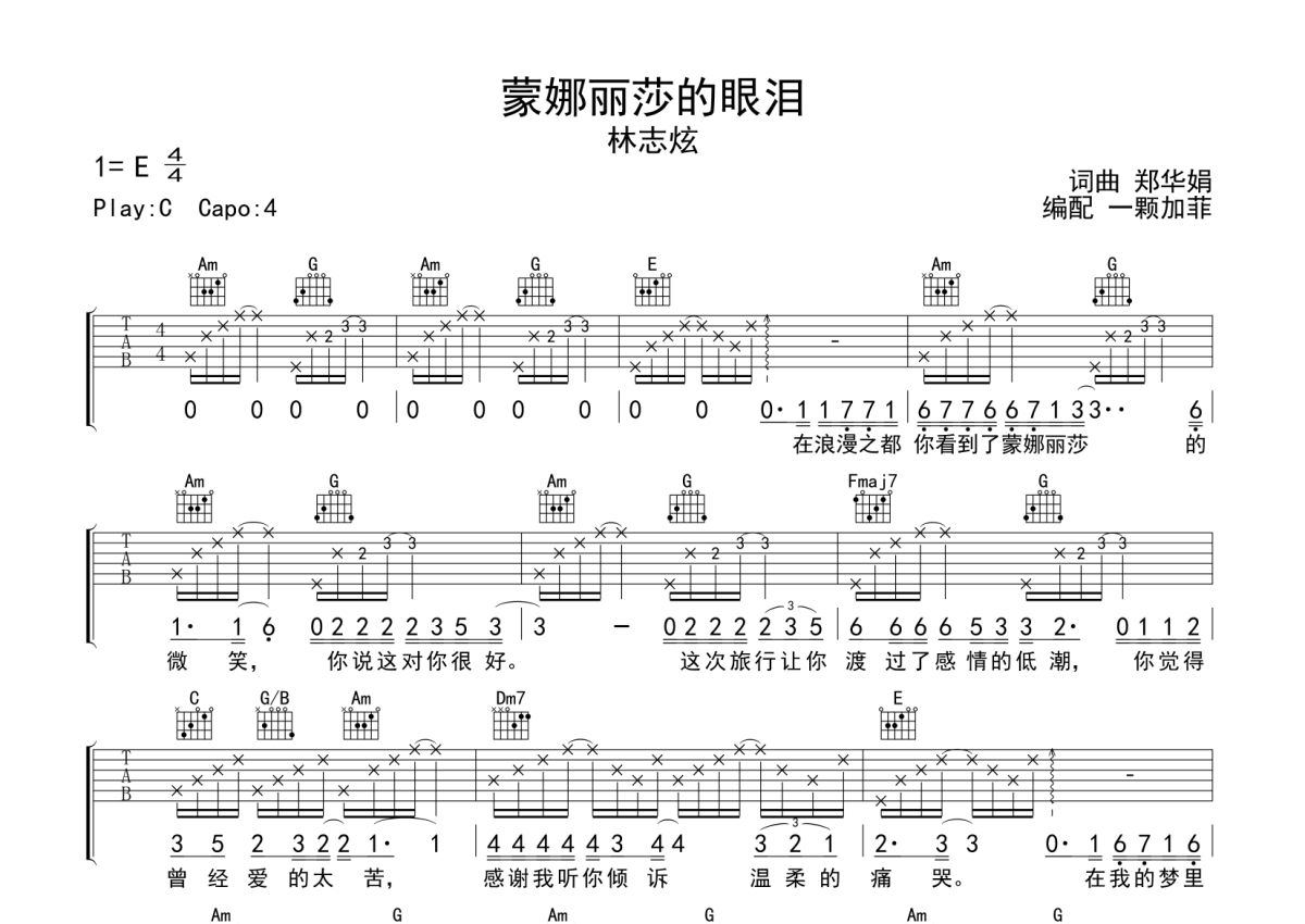 林志炫《蒙娜丽莎的眼泪》吉他谱 - C调弹唱六线谱
