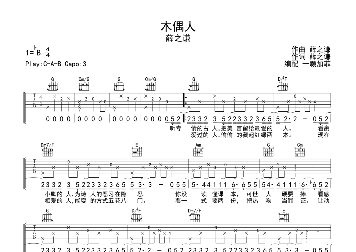 木偶人吉他谱 - 薛之谦演唱 - G调弹唱六线谱