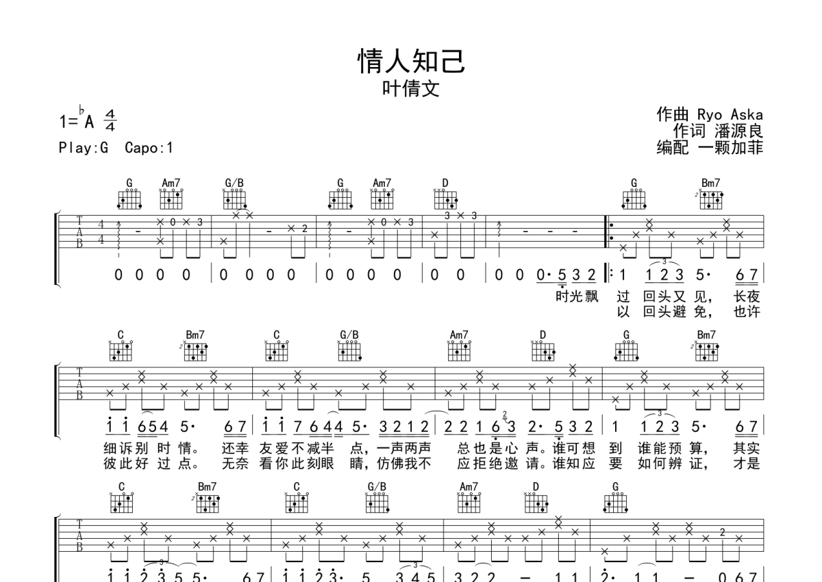 《情人知己》是叶蒨文演唱的一首歌曲,本吉他谱采用的是G调指法编配,这份吉他谱共有两张高清图谱,图谱由 @一颗加菲 编配上传,图谱使用六线谱编配,包含吉他和弦指法、简谱以及歌词部分,曲谱配备了相关的音频提供试听,使用这份情人知己吉他谱,可以让你更加方便地掌握这首歌曲的弹唱技巧,快来尝试吧。